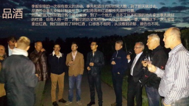 李毅安排的一次很有意义的活动。事先和酒庄约好时间人数,到了那天就过去。 品酒 品酒师会事先安排好相关环节。比如将各种红酒都预先藏好位置。 然后带领大伙在酒庄各个地方逛游,到了一个地方,冷不丁从不起眼的地方拿出事先放好 的红酒,给每人倒一点,讲解它的历史和特性。大伙总是狂笑一番。猜测这下一次从哪里 拿出红酒。我们品尝到了8种红酒,口感各不相同,从淡雅到浓郁,颜色也不同。